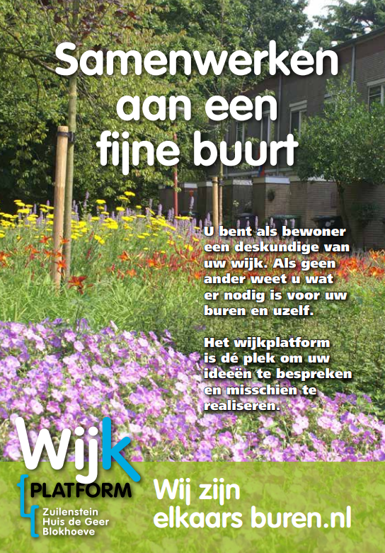 U bent als bewoner een deskundige in uw wijk. Als geen ander weet u wat er nodig is voor uw buren en uzelf. Is er een kinderspeelplaats nodig of stoort u zich aan een verkeersituatie? Het wijkplatform is dé plek om uw ideeën te bespreken en misschien te realiseren. Bewoners van Zuilenstein, Huis de Geer en Blokhoeve zetten zich via het Wijkplatform in voor een prettige woonomgeving. Wij worden hierbij ondersteund door de Gemeente Nieuwegein, Politie, Movactor en de woningcorporaties.