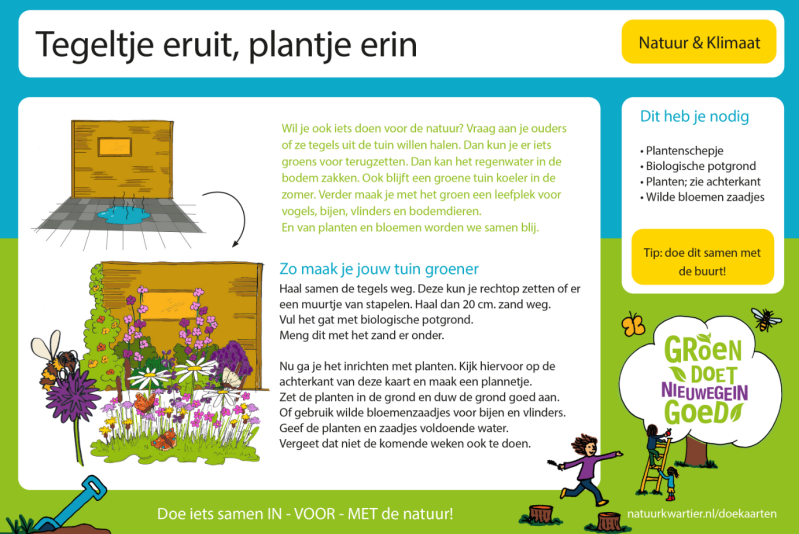 Op zaterdag 8 april 2023 van 11.00 tot 14.00 uur was het voor de inwoners van Vreeswijk mogelijk tuintegels te ruilen tegen een plantje. Het Wijkplatform Vreeswijk, Groen doet Nieuwegein Goed, Samen Duurzaam Nieuwegein, Reinaerde Zorg, en de gemeente Nieuwegein deden u een aanbod met de actie: Tegel eruit, Plant erin.